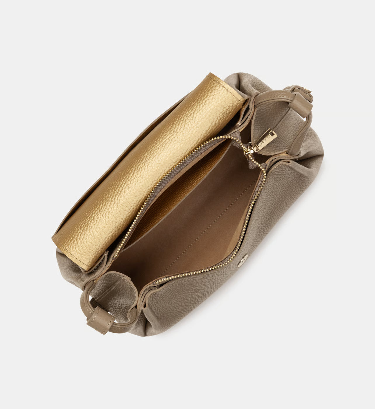 Le sac trotteur Accordéon Double de Lancaster est confectionné en cuir de vachette grainé certifié LWG Gold, assurant durabilité et élégance. Fabriqué en France.
