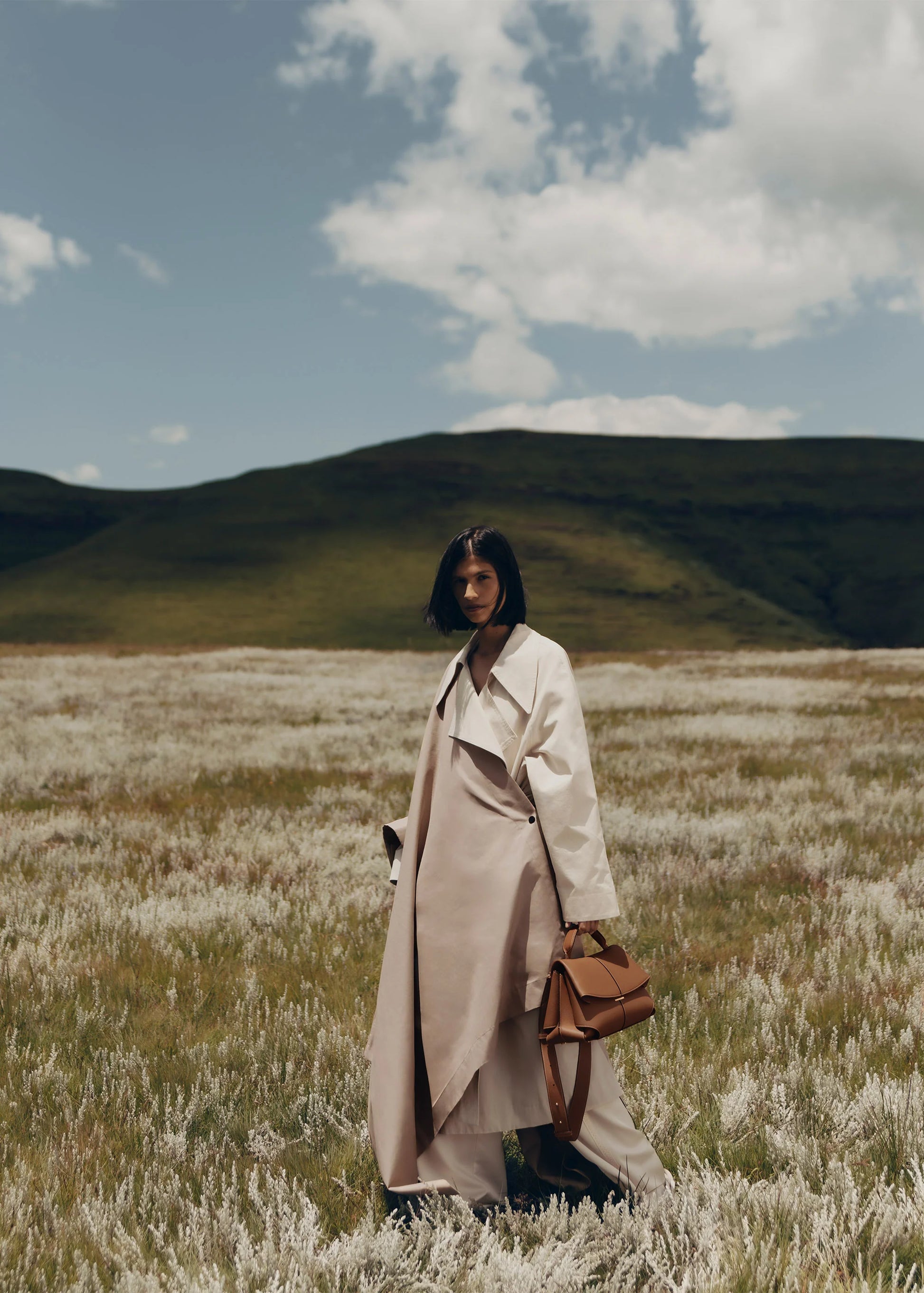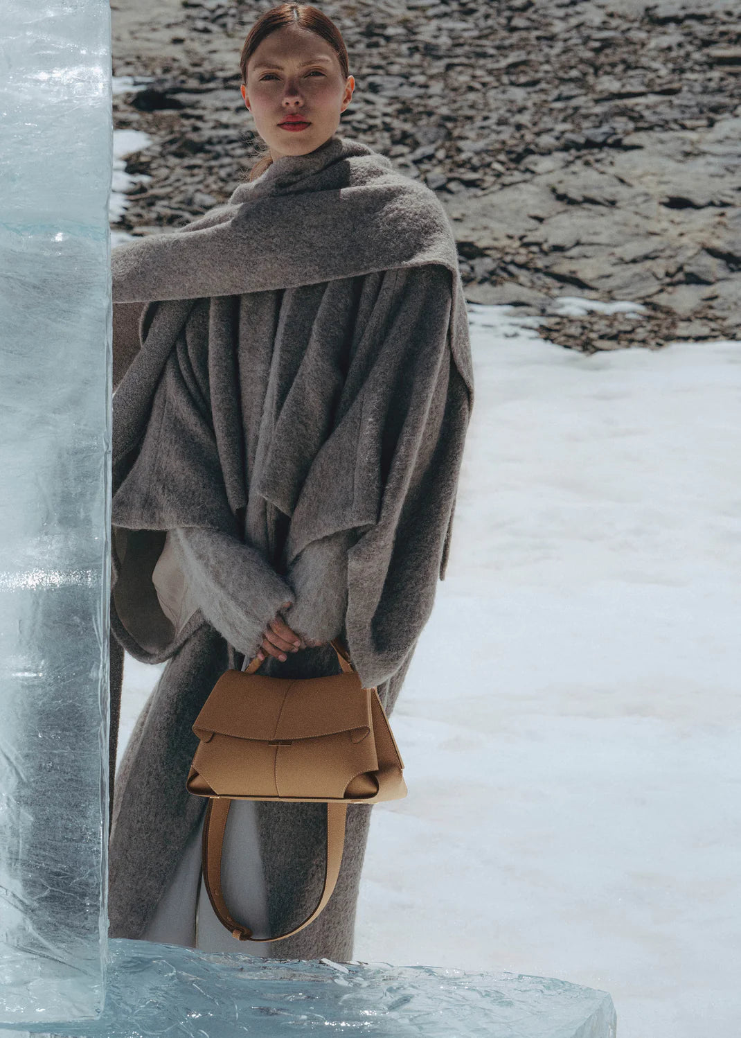 Le sac Mokki en cuir grainé camel met en valeur l’art du pliage à travers ses lignes structurées et angulaires. Le contraste entre le cuir grainé et le cuir lisse, particulièrement visible sur les coins, apporte une texture raffinée.